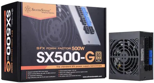 Support standard SFX form factor Silent running 92mm fan with 18 dBA minimum All Japanese capacitors. High efficiency with 80 PLUS Gold certification Class-leading sin +12V rail. Strict 3% voltage regulation and low ripple & noise 100% modular cables. All cables made with flexible flat arrays Packaging may vary