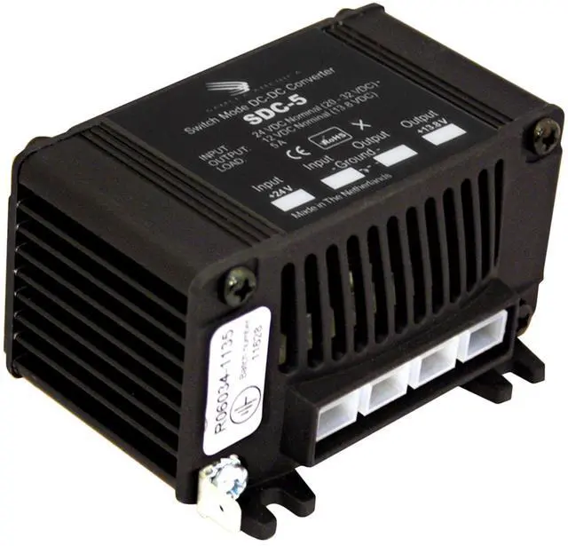 pstrong5A Non-Isolated Step-Down 24VDC-12VDC ConverterstrongppThis high efficiency switch-mode step-down DC-DC converter converts an input voltage of 24 VDC nominal (range 20 VDC to 35 VDC) to a highly regulated output voltage of 12 VDC nominal (13.8 VDC) at 20 Amps. The SDC-23 DC-DC converter is non-isolated (no galvanic isolation between input and output) and meant for use in negative ground systems. Features include overvoltageshort-circuit protection, temperature compensated current limit, output-side overvoltage protection, input-side overvoltage transient protection and input-side reverse polarity protection. The SDC-23 DC-DC converter is designed for heavy duty applications.ppstrongFeatures:strongpulliAdvanced switchmode designliliMount in almost any locationliliCompact and light weightliliReverse polarity protectionliliHigh efficiencyliliCycle by cycle current limiting circuitliliOvervoltage protectionliliShort circuit protectionliulpstrongSpecifications:strongpulliInput: 20-32