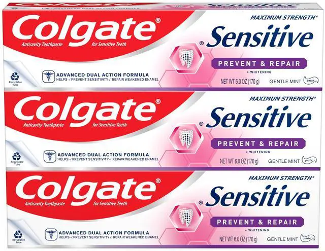 Colgate Sensitive Prevent and Repair toothpaste is a clinically proven formula that works fast, within 2 weeks, and provides long-lasting sensitivity relief and builds a protective shield to help prevent painful sensitivity with regular use. This sensitive toothpaste contains an advanced dual-action formula that helps prevent painful sensitivity and helps repair weakened parts of sensitive teeth. Plus Colgate Sensitive Prevent and Repair toothpaste helps strengthen enamel with fluoride, whiten teeth, defend against cavities and provides the freshness you trust from Colgate.
