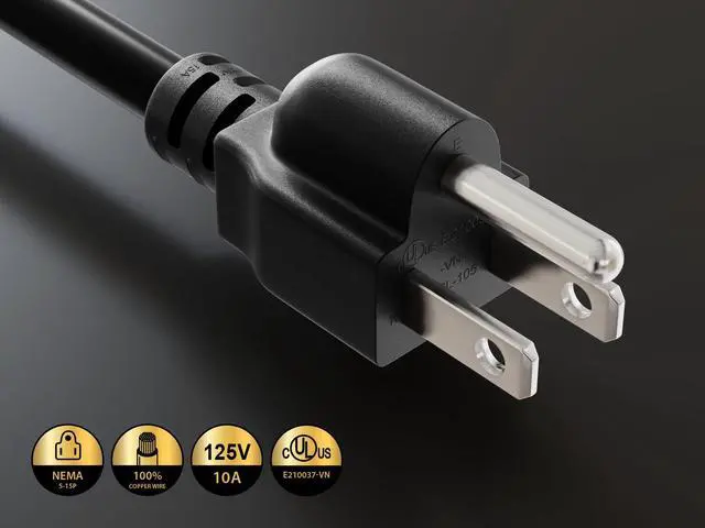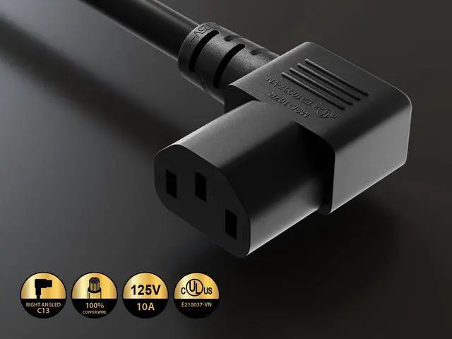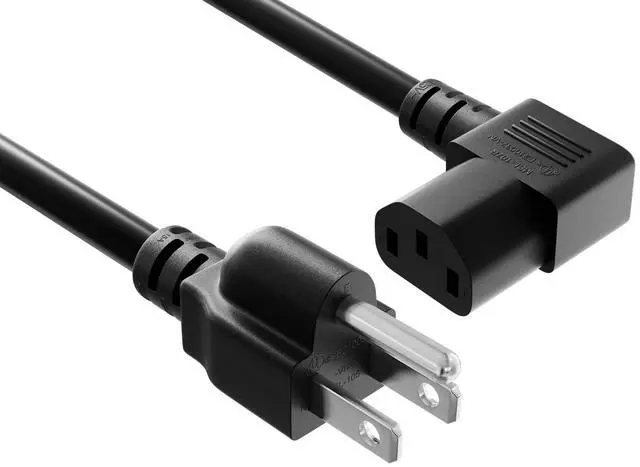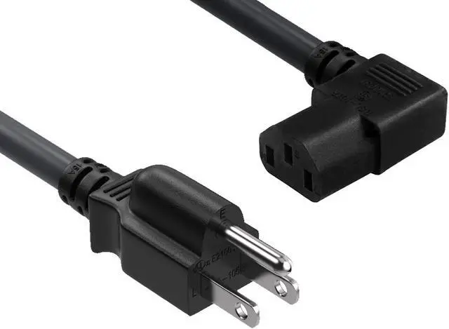18 AWG Universal Right Angle Power Cord (NEMA 5-15P to IEC320 C13R)Our right angle power cable is perfect for getting in to tight places. This standard power cord is designed to work with most PCs monitors scanners printers and other devices that use the 3-pin shroud power connector. Cable features an AC style plug (NEMA 5-15P) on one end and a right-angle computer style receptacle (IEC-320-C13R) on the other end. The female connector plugs directly into the device while the male connector plugs into a standard outlet.