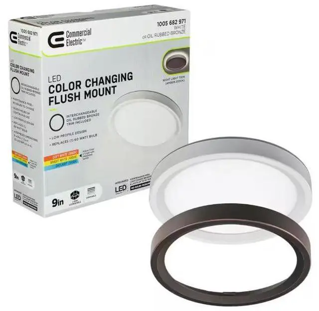 Commercial Electric Low Profile 9in. LED Flush Mount ceiling light is the perfect way to update your lighting by replacing outdated incandescent bulbs with an energy-efficient integrated LED fixture. Prior to installation, keep the existing White trim or choose the Oil Rubbed Bronze trim to add a little pop of color into your space. Additionally, select between 3 color temperatures of light output: Soft White, Bright White or Daylight using the slide switch on the back of the fixture. Activate the Night Light feature which emits a Soft Amber glow around the fixture providing warm ambient accent lighting. Our innovative mounting system allows for quick installation into existing junction boxes using the TwistFit mounting bracket. (included) This flush mount is maintenance free with no bulbs required and lasts up to 50,000 hours. Great for kitchen, pantry, bedrooms, bathrooms, closets, stairways, hallways, basement, laundry room, craft room, playroom, den/office, retail store or boutique