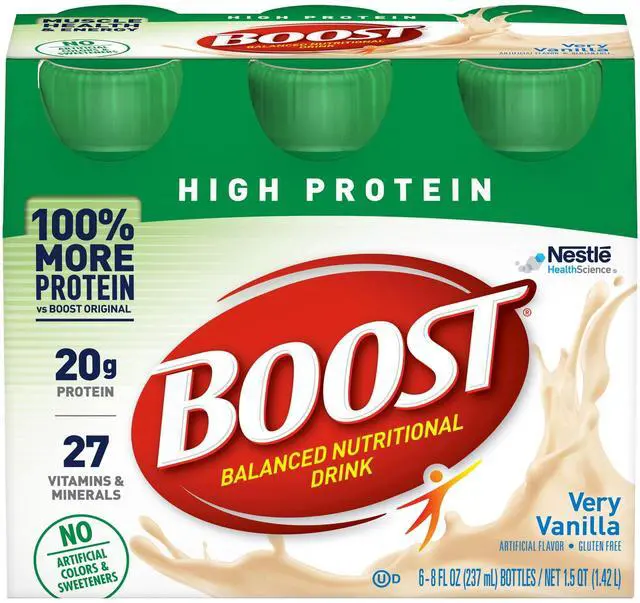 • Boost Very Vanilla High Protein Drink, 8 Fluid Ounce - 6 per pack -- 4 packs per case. With 15 grams of high quality protein, BOOST High Protein Drink provides an excellent source of protein for individuals recovering from illness, injury, or surgery, and who need additional protein to help build and repair tissue. In addition, it provides Country of Origin: United States