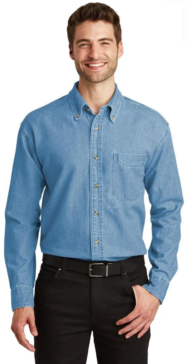 Showcase your logo on America's favorite fabric. You'll find versatility and reliability in our stonewashed denim shirt. | 6.5-ounce, 100% cotton Double-needle stitching throughout Button-down collar Horn-tone buttons Left chest pocket Rounded adjustable cuffs Due to special finishing process, colors may vary.