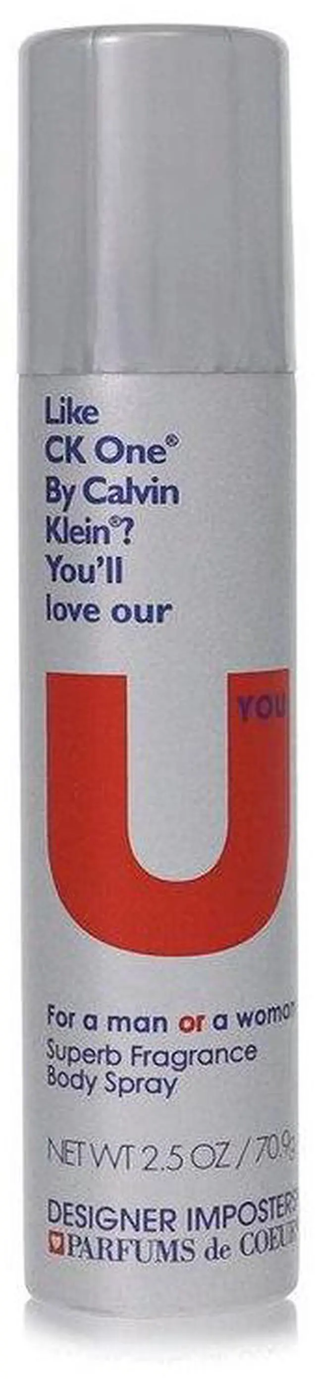 : br Incorporating the same bergamot, lemon, mandarin, jasmine and lily of the valley scent notes that made Calvin Klein's Ck One a hit, Designer Imposters U You elevates your self-confidence every time you splash a bit of the scent on your neck and wrists. Wear this fresh, clean scent from Parfums de Coeur to your next meeting to exude self-assurance, or use it before you meet with a big client to inject swagger into your step.