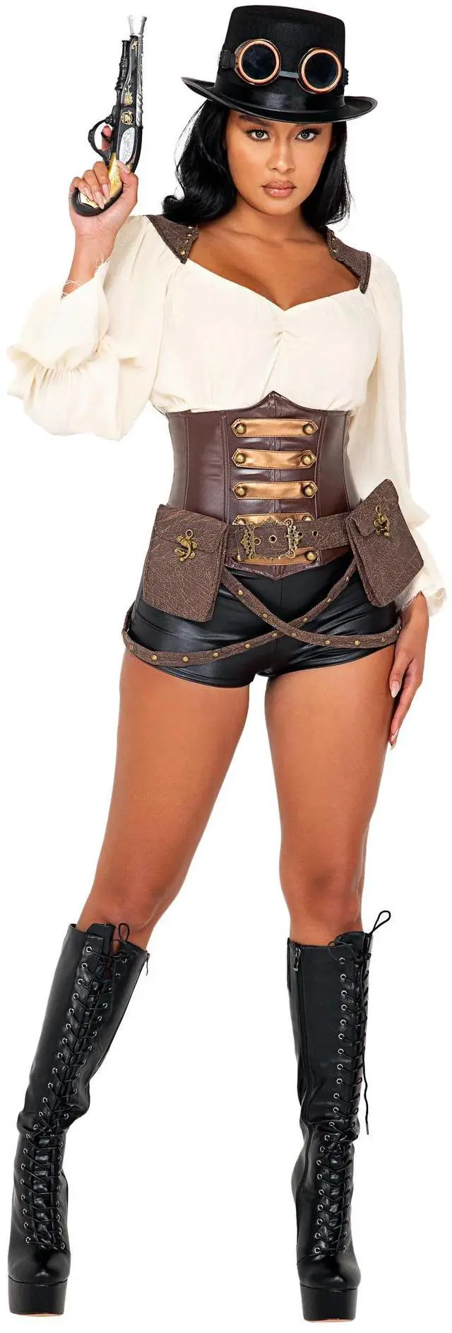 DescriptionRoma's 7pc Industrial Vixen Steampunk Costume Features a Longsleeve Blouse with Shoulder Accents, A Waist Cincher and a Belt with Two Pouches and Criss-Cross Straps and Black Shorts. Includes a Black Top Hat with Goggles and a Toy Gun. Boots are NOT Included