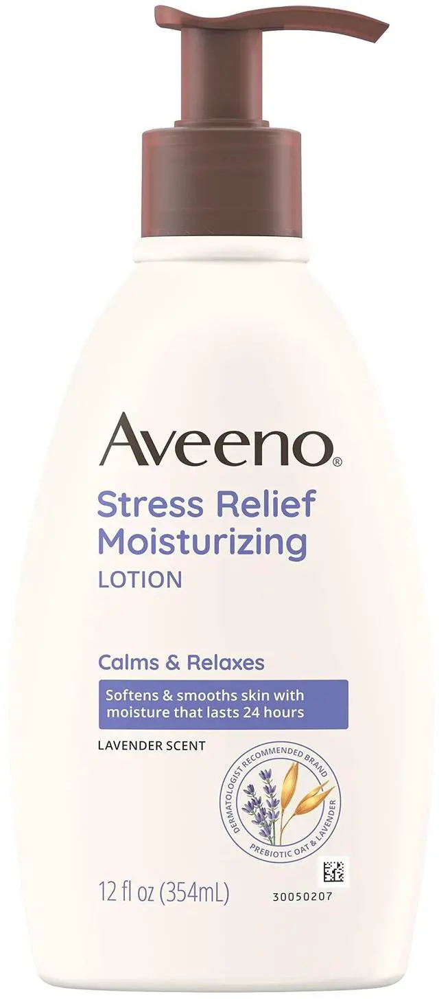 Product DescriptionAveeno Stress Relief Moisturizing Body Lotion with lavender scent and prebiotic oat helps calm and relax you while moisturizing for a full 24 hours to leave skin soft and smooth. Using the goodness of nature and the power of science, this soothing daily body lotion is made with prebiotic oat and intensely hydrates skin, leaving it feeling soft and smooth. It also combines the calming scent of lavender and prebiotic oat to help calm and relax you as you massage it into your skin to help you unwind and lock in moisture. This lavender scented body lotion has a nourishing non-greasy formula that absorbs quickly for lasting moisture throughout the day and is from Aveeno, a dermatologist recommended brand for over 70 years.
