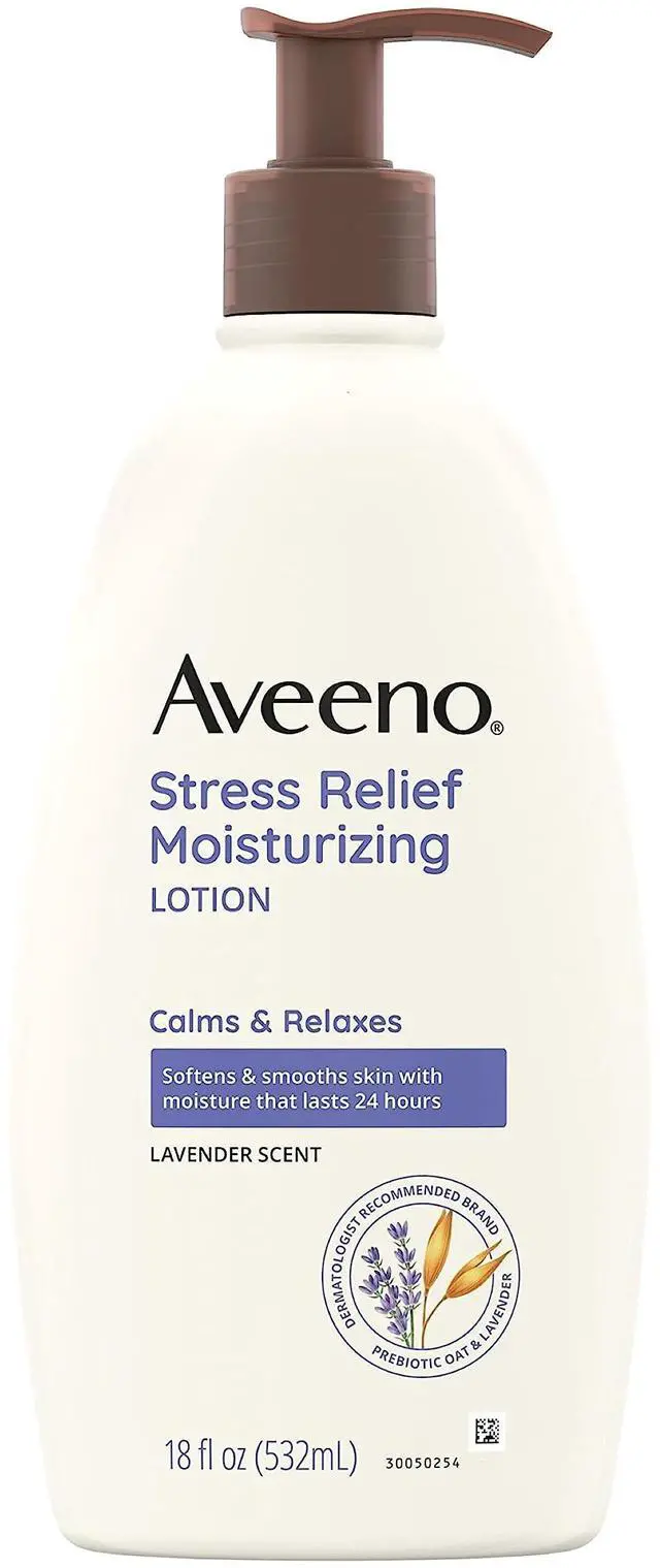 Product DescriptionAveeno Stress Relief Moisturizing Body Lotion with lavender scent and prebiotic oat helps calm and relax you while moisturizing for a full 24 hours to leave skin soft and smooth. Using the goodness of nature and the power of science, this soothing daily body lotion is made with prebiotic oat and intensely hydrates skin, leaving it feeling soft and smooth. It also combines the calming scent of lavender and prebiotic oat to help calm and relax you as you massage it into your skin to help you unwind and lock in moisture. This lavender scented body lotion has a nourishing non-greasy formula that absorbs quickly for lasting moisture throughout the day and is from Aveeno, a dermatologist recommended brand for over 70 years.
