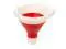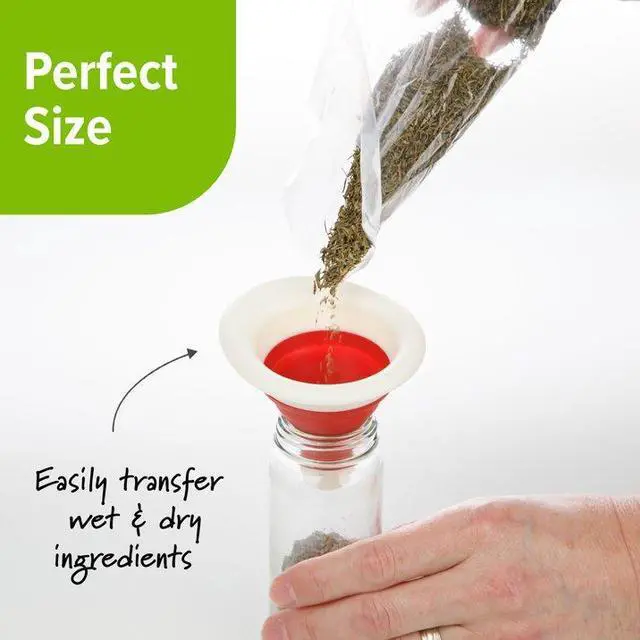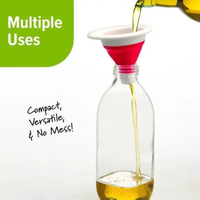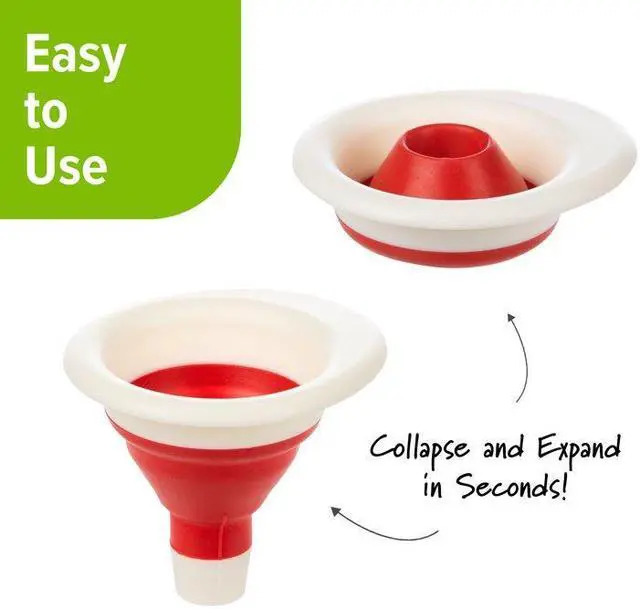 The Collapsible Mini Funnel from Prepworks is designed to perfectly fit smaller bottles and is ideal for use with liquids, spices, and other powdered ingredients. Made from durable plastic, the Progressive Prepworks Collapsible Mini Funnel folds to 1" so its an easy fit in any drawer. Includes 1 Collapsible Mini Funnel of random color selection. Dishwasher safe.