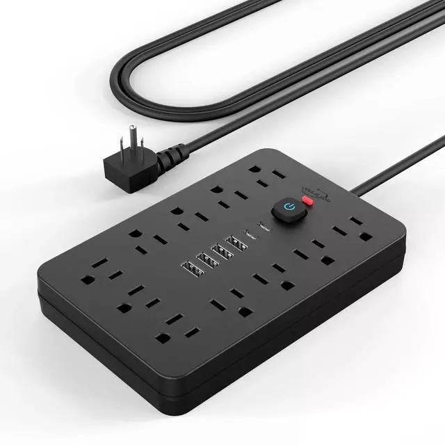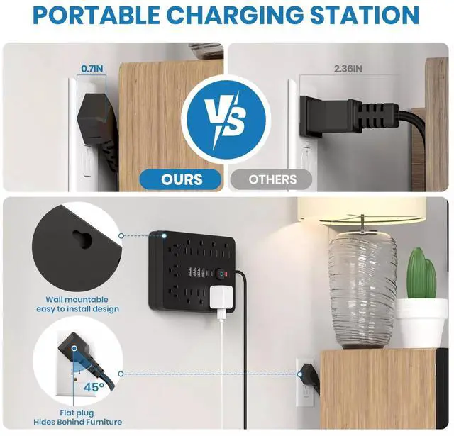 Flat Extension Cord: With a slim 0.7 -inch flat head design, this power strip can easily fit into tight spaces, such as behind sofas and beds. The 45° angled design ensures that bottom plugs are not blocked, and the 5-foot heavy-duty extension cord offers superior current-carrying capacity