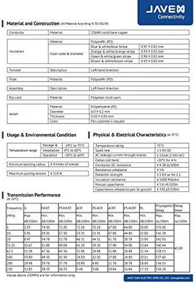 [High-speed Transmission] JAVEX premium Cat6 23AWG CMX rated network cables meet up–to-600Mhz performance to support data transmission and comply with IEEE 802.3af (PoE) / IEEE 802.3at (PoE+) in structure cabling for horizontal and building backbone [Sequential Foot-Marking]: the running "FT" Count on cable makes cabling system installation with excellent precision [Bare Copper Conductor]: Solid bare copper (BC) delivered the signal fidelity and durable long-lasting quality compared to copper clad aluminum (CCA) [Outdoor CMX Rated]: The UL CMX-rated PE jacket is durable and designed for outdoor usage. The UV-resistant and weather-proof jacket is perfect for above-ground applications [Certified Quality] : JAVEX Ethernet cables guarantee the certificated quality defined by UL listed (E516648), ANSI/TIA, and U.S. product safety standard as well as leading testing lab-ETL VERIFIED TO TIA-568.2-D