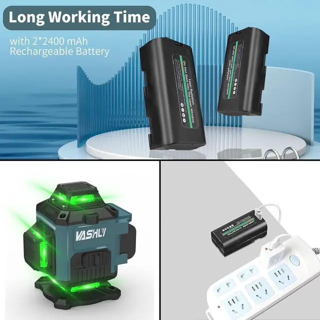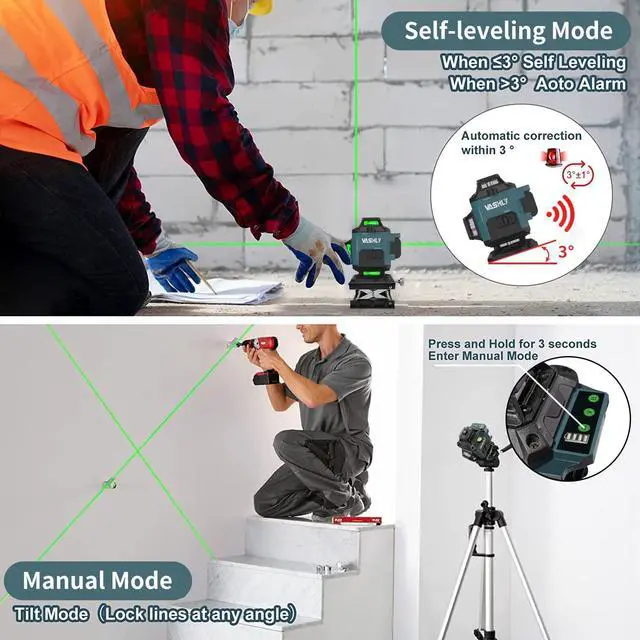 Self Leveling Line Lasers & 2 Rechargeable BatteriesWhen the 360 laser level is turned on, it is in self-leveling mode, If not within 3° of the horizontal, the laser will flash and beep as a warning. The alarm won't go off until we put it in a level place ( <3°).The laser level uses large-capacity 3.7V / 2400mAh rechargeable batteries, each providing up to 6-8 hours of running time. The two batteries can be charged separately or used in the work of the level.