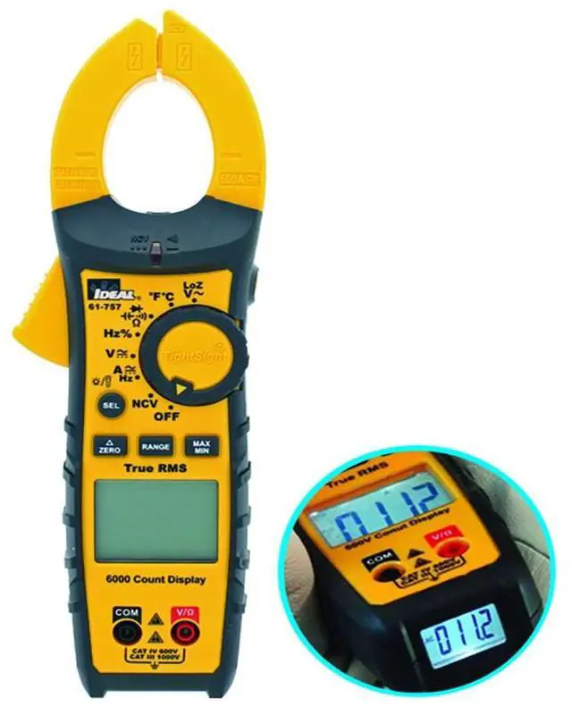 The IDEAL 61-757 TightSight Clamp Meter is a CAT IV 600 CAT III 1000 V rated auto ranging true root mean square (TRMS) digital clamp meter that measures up to 600 Amps AC and DC current via the clamp head. It measures up to 1000V AC and DC, Low impedance AC voltage (Lo Z) (to reduce the possibility of false readings due to ghost voltages), frequency, resistance, continuity, capacitance, and diodes via test-leads (included) and measures temperature (F/C) via a K-Type thermocouple (included). It's capable of detecting the presence of voltage between 40V to 600V via a non-contact sensor in the right tip of the clamp. The patented TightSight LCD display, located on the bottom of the unit, enhances safety and productivity by displaying a secondary reading at the end of the meter, eliminating the need to bend or twist conductors or place you head near the panel in order to see the main meter display. Both displays can be backlit, and a built-in flashlight can be illuminated when working in poor or zero lighting conditions. The unit uses an illuminated red LED in the center of the meter and emits audible tones to notify when voltage is above 30 volts, when continuity is detected and when the NCV senses voltage within its set range.