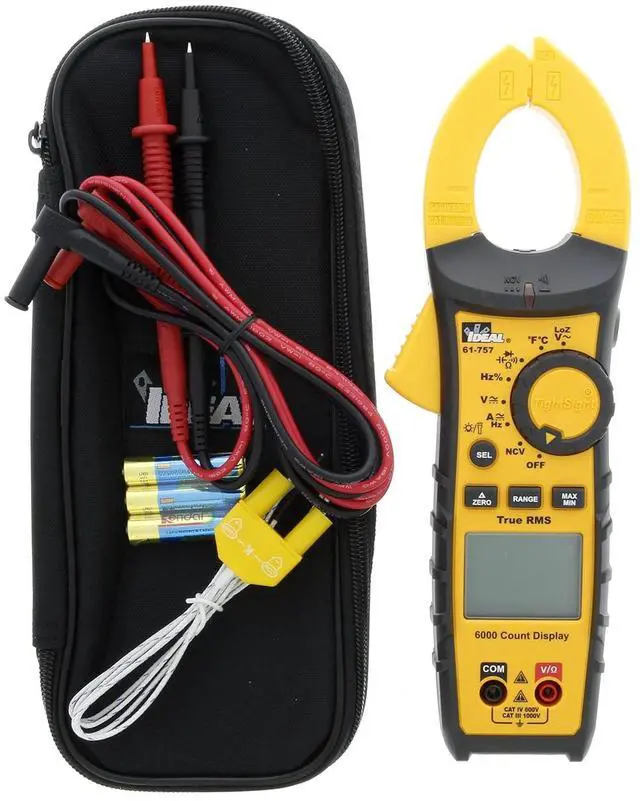 The clamp head has a built-in probe tip holder on the backside of the right clamp to allow measurements holding the clamp in one hand and the second lead in the other hand. The meter has a hanging strap mount (compatible with all other IDEAL meters with this feature) that allows for a hanging strap (sold separately) to be attached to the meter so it can be hung from a nail, screw or magnetic surface. An industrial grade over molding enhances grip and drop protection. This meter features hold, min/max, relative, zero, range, and selectable auto power off functions. The meter comes with 3 1.5V AAA batteries and an easy open, fully accessible storage pouch with a belt loop that allows for meter, probe and thermocouple storage.