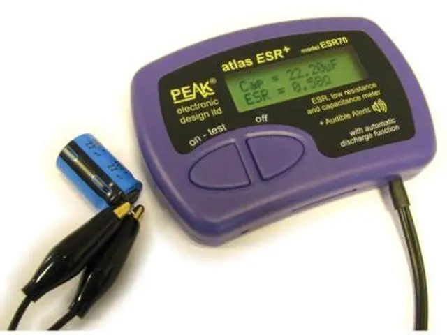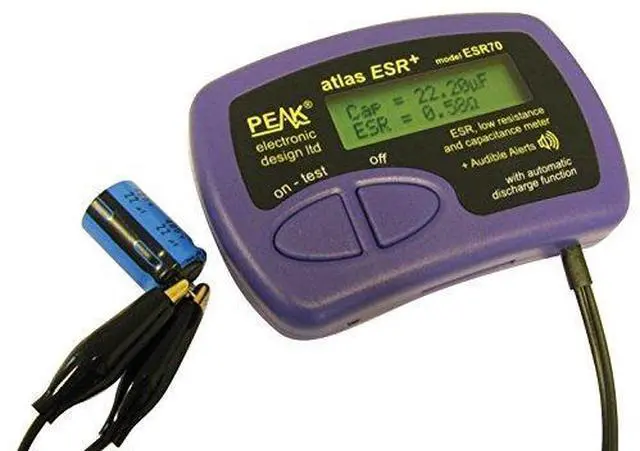 PEAK Atlas ESR70 (ESR PLUS) (Equivalent Series Resistance) Capacitor Analyzer with audible alerts. This new model introduces new features including "Audible Alerts" and enhanced measurement range. Every measurement of ESR will be shown on the display as usual of course, but the unit will also produce a variety of tones depending on the value of ESR. And the tones themselves are surprising pleasant, including "Bell-like" pings (a couple of different types for ESR that is below certain values), and also a "Beep-Barp" type tone for ESR that is likely to be too high.
