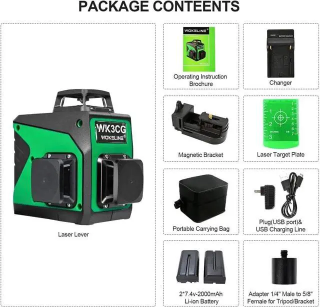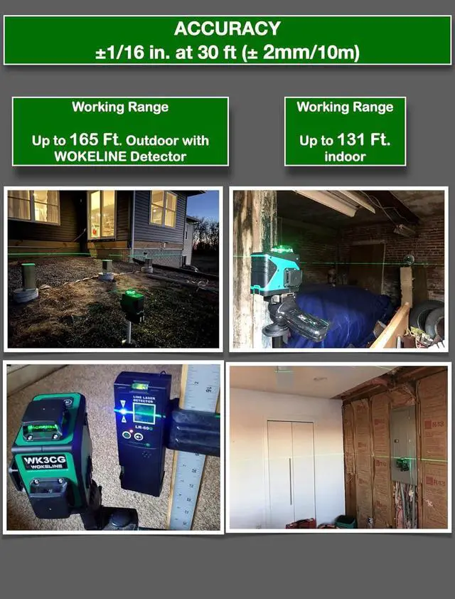 High Accuracy Inside and OutsideThe green laser level line is 3x brightness than the red beam, which can provide a working distance of up to 100ft. Safety level-Class II, <1mW power output. The accuracy at 30 feet is within 1/16 inch to ensure the accuracy of construction The wokeline laser level self leveling has an outdoor enhancement mode, supports a receiver, and can easily handle outdoor operations, such as building construction, garden trimming, outdoor installation, etc.