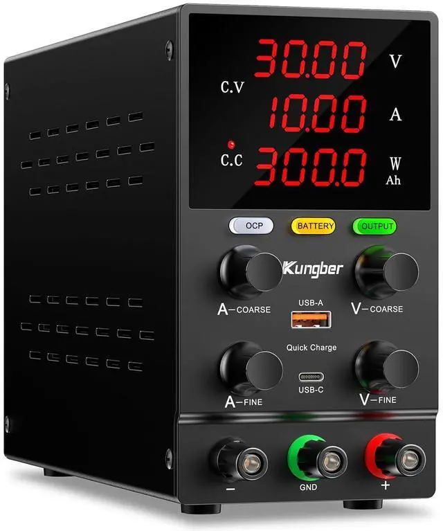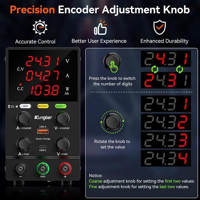 Safety: many safety measures are adopt in Kungber lab DC power supply - Grounding wire, Leakage protection, Thermal protection, Voltage overload protection, Power overload protection and Short-circuit protection. Kungber power supply use premium electronic components, provide reliable working status and prolong the life of product effectively. When the working temperature is more than 122/50, the ligent thermal protection will active the cooling fan to lower the temperature