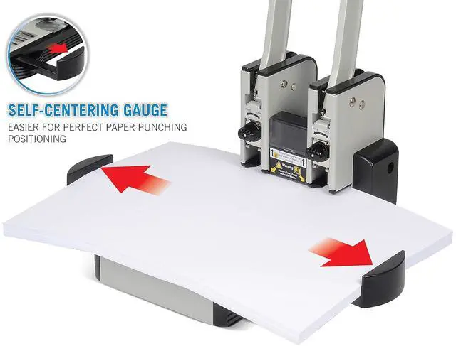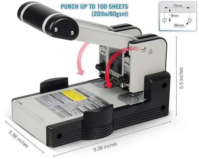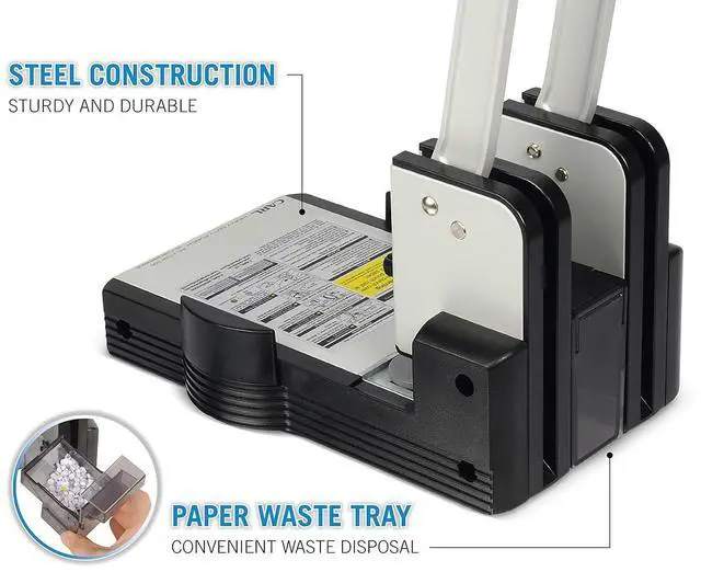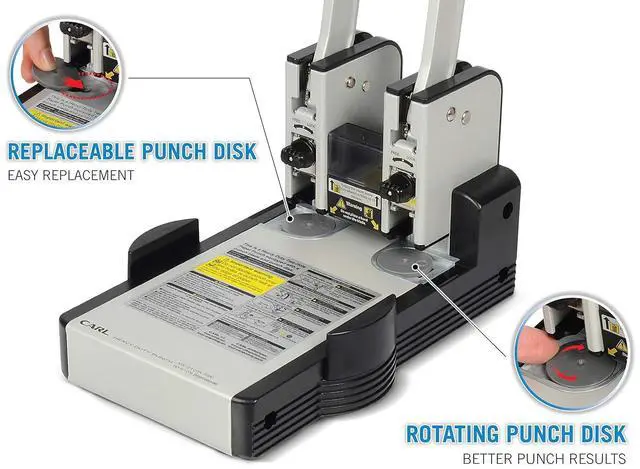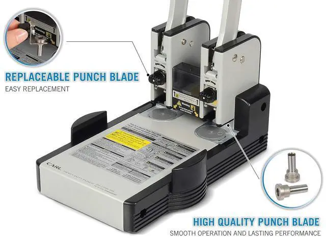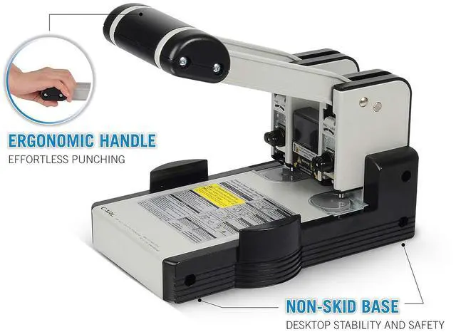 Extra heavy-duty, two-hole punch is ideal for every law and medical office. Extra heavy-duty punch drills through a 100 sheets of standard 20 lb. bond paper with patented Carl Hollow-Core technology and Samurai Steel punch heads to drill through more sheets with less effort. Punch heads are preset to punch 1/4" diameter holes for standard two-ring journals and ledgers. Dual self-centering guides deliver perfect punching every time. Hole punch also offers a large-capacity waste tray, nonskid base and solid metal construction.