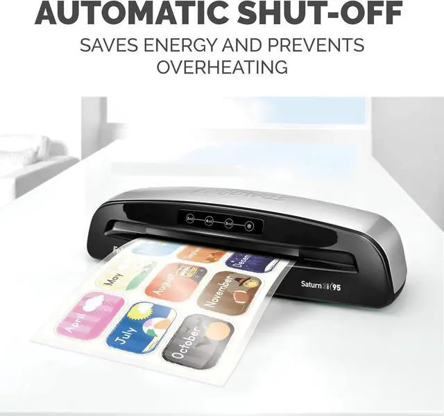 Perfect for use at home, school or the office, the Fellowes Saturn 3i 95 Laminator provides fast, professional and versatile lamination for every project. Preventing the need for long, time-consuming prep, the Fellowes Saturn 3i 95 Laminator features a rapid, 1-minute warm-up with advanced thermal InstaHeat Technology. Versatile in both capability and size, the Saturn 3i 95 includes a 9.5 -inch wide entry that easily accommodates documents of multiple sizes, from business cards to school projects. Different projects may require different lamination techniques, which is why the Saturn 3i 95 allows you to choose between the hot setting for 3-mil or 5-mil pouches, or cold lamination for self-adhesive pouches. To save energy and prevent overheating, the Saturn 3i 95 comes equipped with an automatic shut-off function. Engineered from the inside out for flexible, simple and jam-free use, the Saturn 3i 95 includes a jam release lever that allows you to easily disengage pouches for re-centering or removal. Every Saturn 3i 95 comes with a set of ten 3-mil letter-sized pouches.