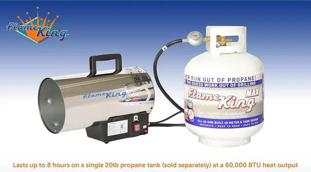 EASY OPERATION: Made to be powered with propane tank using the hose with built-in regulator it arrives with and standard wall plug in. LONG LASTING: Lasts up to 8 hours on a single 20lb propane bottle (sold separately) at a 60, 000 BTU output.