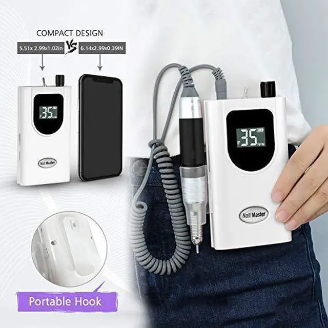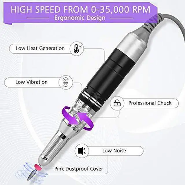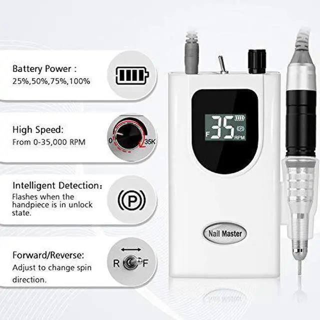 RPM: This professional nail drill is equipped with a high-quality brushless motor that rotates the variable speed control button to make it work smoothly at an adjustable speed (0-35, 000 RPM). For salon professional nail technicians or people who want to start their nail beauty at home, this is an ideal nail drill machine.