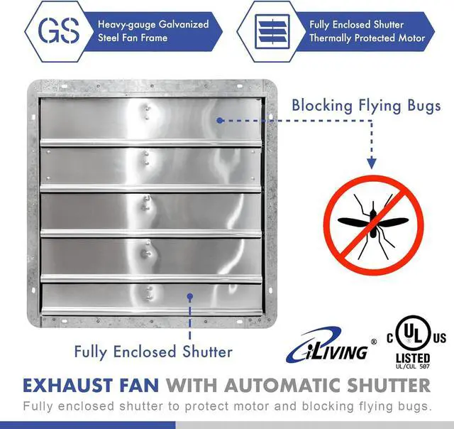 - BUILD TO LAST - Industrial grade galvanized steel frame with aluminum shutters and fan blades, reliable direct drive motor, Variable speed, UL certified, Noise Level < 69dB. Ideal for warehouse, garage, greenhouse, workshop exhaust and dust extraction. Corrosion-resistant with OSHA compliant wire guards. UL Listed with speed controllable, permanently lubricated motor