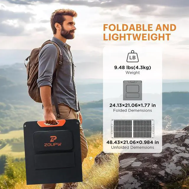 - Portable, Foldable and Easy SetupThe travel solar panel only weighs 9.48 lbs, the folded size is 24.13 * 21.06 * 1.77 inches and it comes with a magnetic handle for easy carrying around. Equipped with 2 kickstands, the portable solar panels for RV can be firmly placed on the ground. Within a few seconds you can easily adjust the foldable solar panel's angle to optimize sunlight absorption and set it up to efficiently harness solar energy.