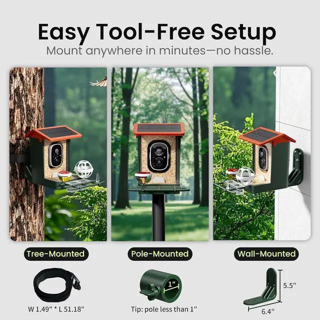 - Easy Setup & Multi-Mount Installation: No complicated installation needed! Mount it on a tree, pole, or wall in minutes. The spill-proof seed container keeps feeding clean and hassle-free, so you can enjoy birdwatching without extra maintenance. And the bird feeder camera is connected to 2.4GHZ WiFi (not support 5GHZ).