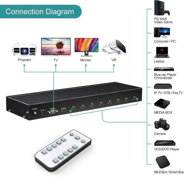 EDID: HDMI switch 8x1 allows to input 8 HDMI sources on one HDR monitor. Please use HDMI 2.0 or 2.1 version cable for better performance.