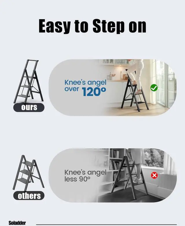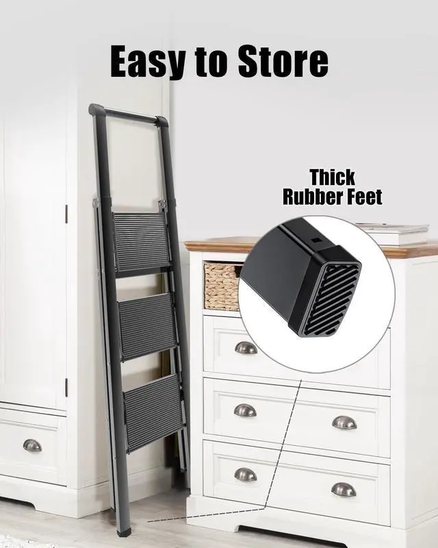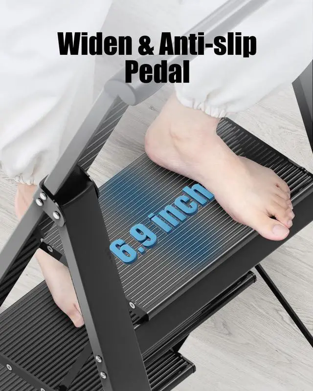 - Anti-Slip Pedals & Rubber Feet: The pedal design has a non-slip pattern to increase friction and prevent the sole of the foot from slipping. The rubber feet at the bottom of the ladder can prevent the ladder from sliding and scratches on the floor