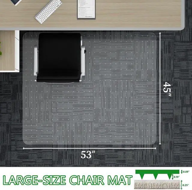 - Large Size & Easy to Flat: 45 X 53 inches large desk chair mat for carpet is suitable for medium to large-size work areas such as an apartment, dorm, or home office. Packaged rolled up for shipping stability, please review the instructions for the best results with our easy- flattening process.