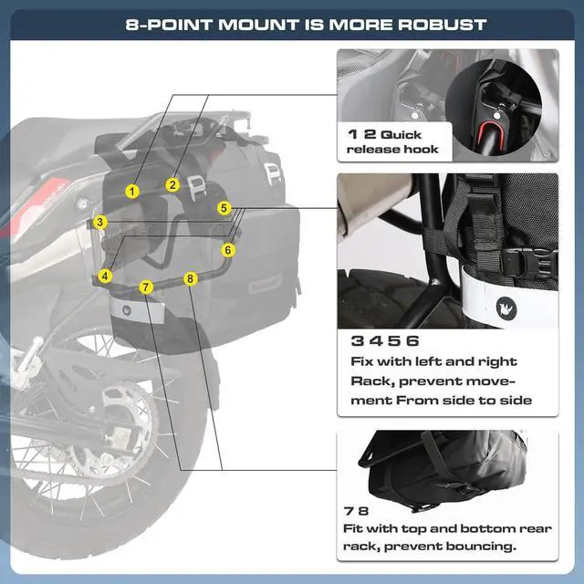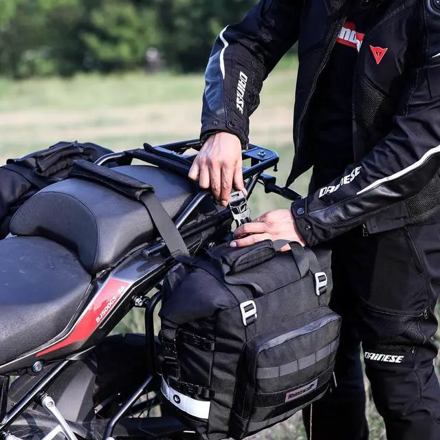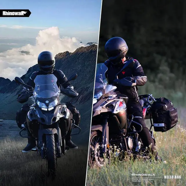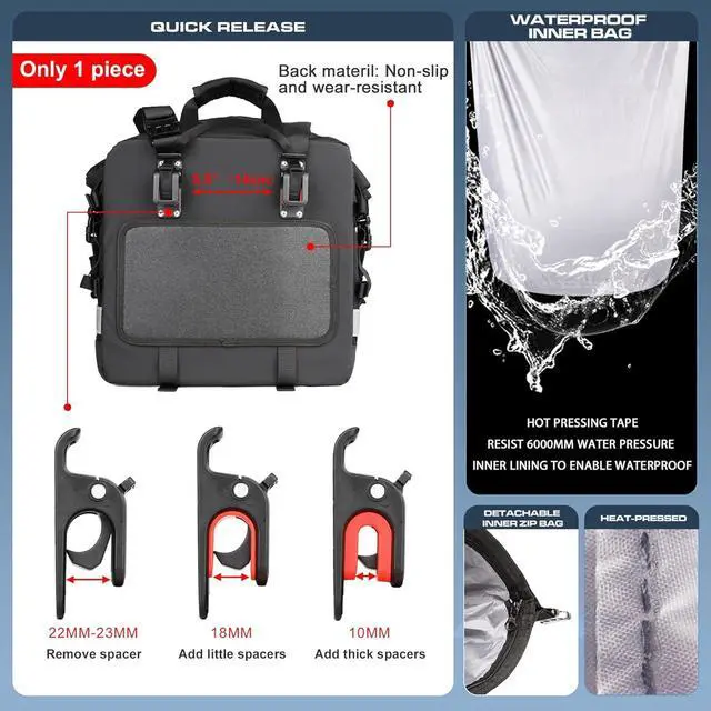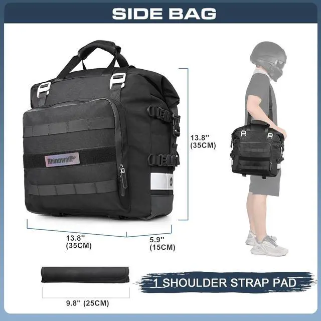 Removable waterproof inner bag, use hot pressed tape+ resist 6000mm water pressure inner lining to enable waterproof, no worries on rainy days. Reflective logo printing for increased night riding safety. falseProvide multiple sizes of gaskets, suitable for most motorcycle with 10-23mm side rack, could be installed with or without exhaust pipes on the left and right sides. false- Back plate use non slip and wear resistant material, fits the frame position to ensure that the paint will not worn. Each bag is equipped with a single shoulder strap.