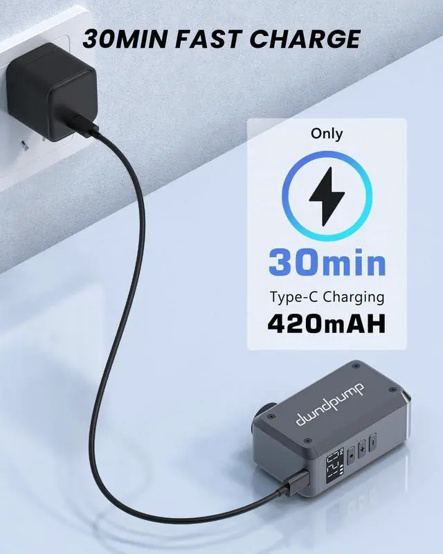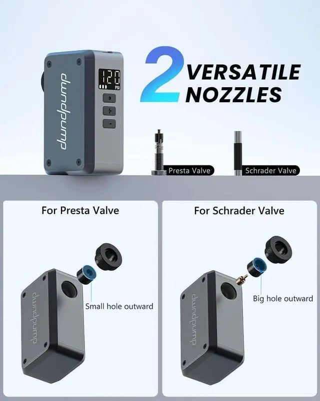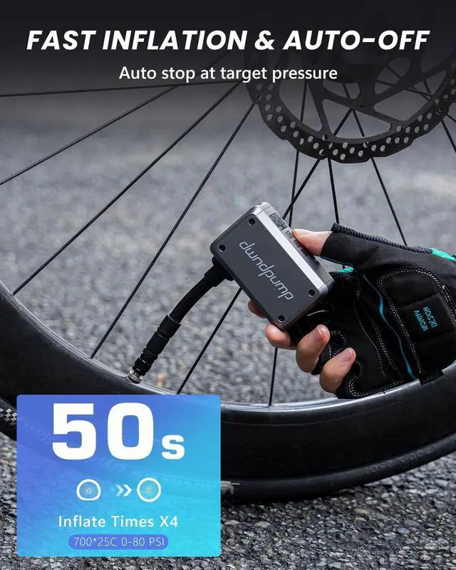 Auto Shut Off FunctionOur bicycle pump will auto shut off when the target pressure is reached. You don't worry about over-inflation and ensuring optimal pressure every time. falsePortable Mini SizeOur tiny bicycle air pump is compact and lightweight at only 130g( 0.29 lb), taking up little space. Rechargeable mini bike pump works with road bikes, mountain bikes, basketball, soccer, volleyball, etc. false- Fast & Efficient Inflationdwndpump mini bike pump features its 15 L/min wind speed. It only takes 50 seconds to reach 80 PSI on a 700*25C road bike tire.
