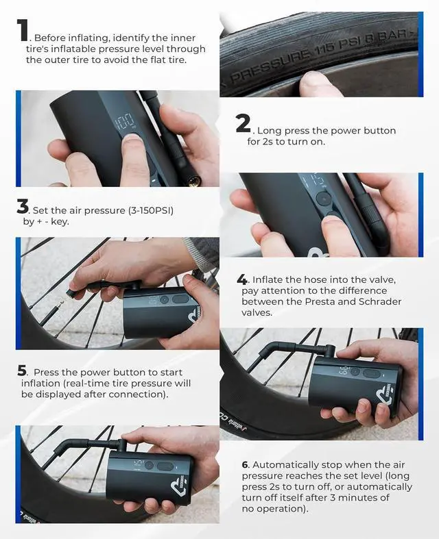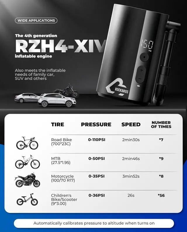 - Smart Auto-Shutoff: Set your desired pressure, and the RZH4-XIV will handle the rest. This bike tire pump automatically stops when it reaches the target pressure, ensuring precision and convenience every time