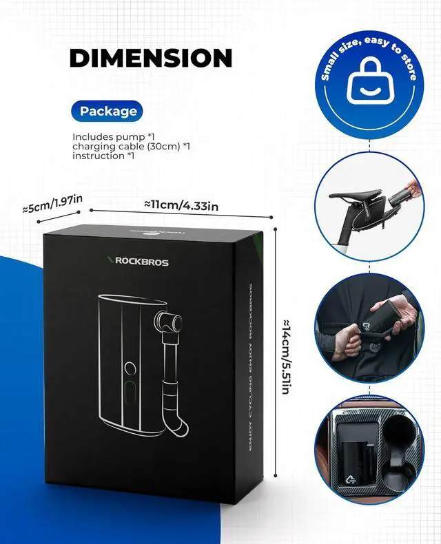 Package: Inside the box, you'll find the versatile all-in-one device featuring the hose, Presta, and Schrader valves. Along with the RZH4-XIV, you'll receive a charging cable and an instruction manual, making it a comprehensive and user-friendly packagefalse-
