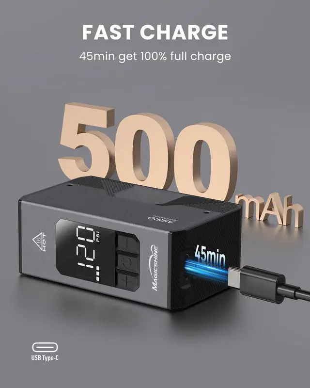 - Long-Lasting & Rapid RechargePowered by a 7.4V 500mAh battery (3-4 full charges at 80PSI) and Type-C fast charging (45 mins), this mini air pump ensures readiness for travel, emergencies, or dailyelectric bike pump use.