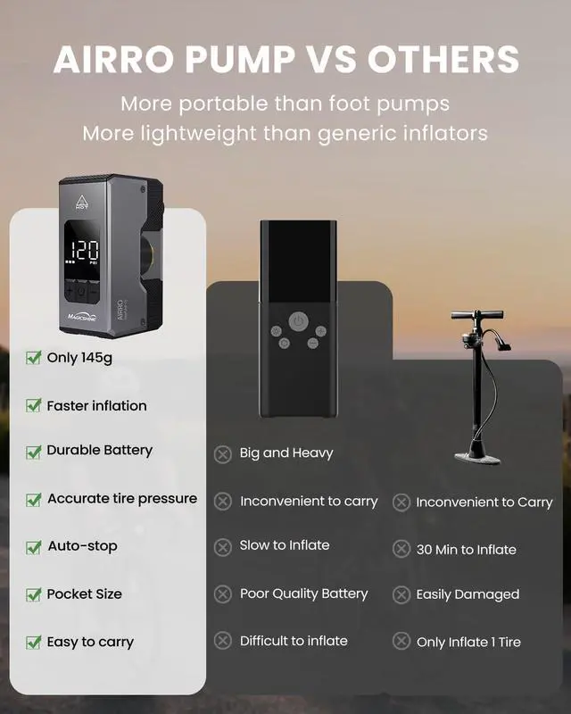 Smart Auto-Stop & User-Friendly DesignAutomatically stops at your preset PSI/Bar to prevent over/under-inflation. Easily switch units, set targets, and control the bike pump portable with intuitive one-touch operation. falseLong-Lasting & Rapid RechargePowered by a 7.4V 500mAh battery (3-4 full charges at 80PSI) and Type-C fast charging (45 mins), this mini air pump ensures readiness for travel, emergencies, or dailyelectric bike pump use. false- Powerful & Efficient Electric Bike PumpEquipped with a robust brushless motor, this mini bike pump delivers a max pressure of 120PSI, perfect for electric bike, bike tire pump, and bicycle pump needs.