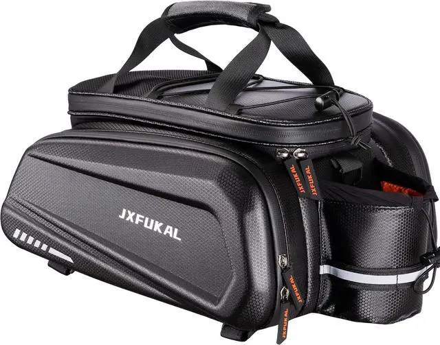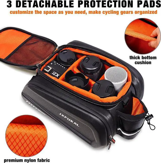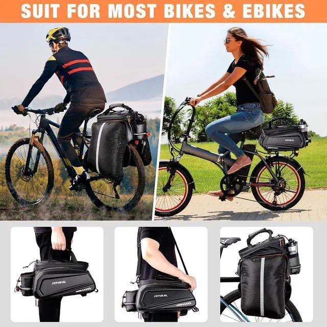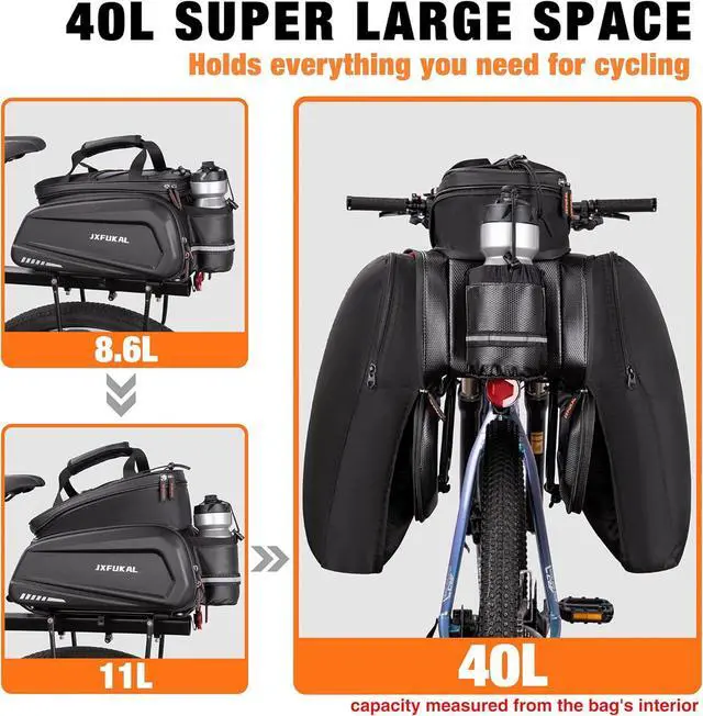 CAPACITY: Our bike rack bag includes a main compartment with 3 removable dividers, an expandable top layer and 2 fold-out panniers. It's up to 40L, large enough to store and keep organized everything you need for daily and long-trip rides, such as bike tool kit, pump, wallets, phones, power banks, small speakers, towels, clothes, food, drinks, bike locks, sunglasses, etc.