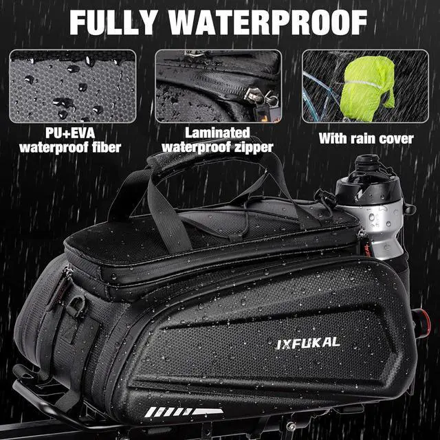- WATERPROOF HARD SHELL DESIGN: The bike trunk bag is made of EVA, coated with PU. It features water resistant, sturdy, lightweight, and easy to clean. Solid shapes make it not deform and look stylish. The bike bag also comes with a rain cover, so no worry about cycling on a rainy day.