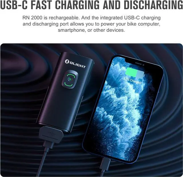 - [USB-C Fast Charging and Discharging] RN 2000 bike front light takes 3.5 hours to be charged fully. You can recharge the battery or power your bike computer, smartphone, or other devices while on the