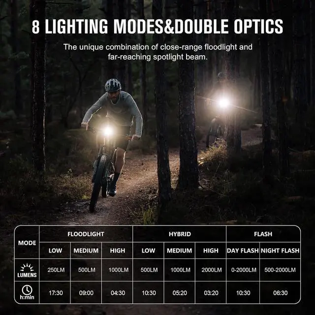 [Smart Sensors] This bike light features a built-in light sensor that automatically switches to a brighter setting when entering a tunnel and a vibration sensor to conserve power in a pit stopfalse[USB-C Fast Charging and Discharging] RN 2000 bike front light takes 3.5 hours to be charged fully. You can recharge the battery or power your bike computer, smartphone, or other devices while on the gofalse- [High Performance] RN 2000 is equipped with two high-power LEDs, max output of 2000 lumens and max throw of 557ft, which is super bright. This bike light provides a max runtime of 17.5 hours