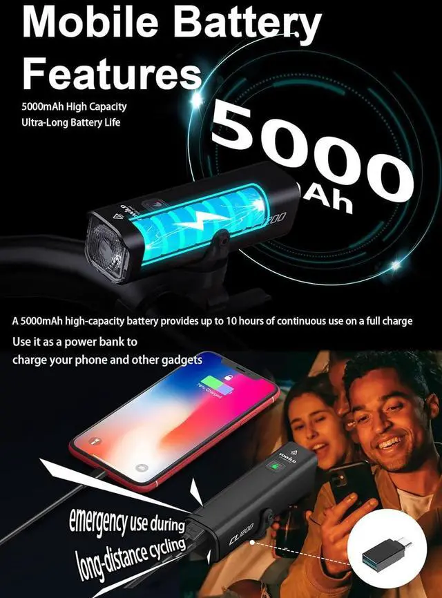 - LED BIKE LIGHT RECHARGEABLE - Build-in a rechargeable battery with 5000mAh, allows you to commute 10hr at 300 lumen, medium 600 lumen runs 5 hours and high 1200 lumens 2 and 3/4 hours. Fully charged in four hours with USB-C cable. Also can charge your phone and cycling computer