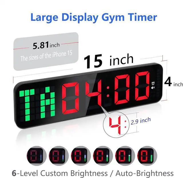- Large Led Digits DisplayThe size of gym timer is: 15*4* 1.2 inch with large 2.9 inch digits, 6 levels brightness dimmer, also has a built-in automatic dimming sensor, can auto-adjust brightness according to light changing, easy to read for gym/garage/home/warehouse