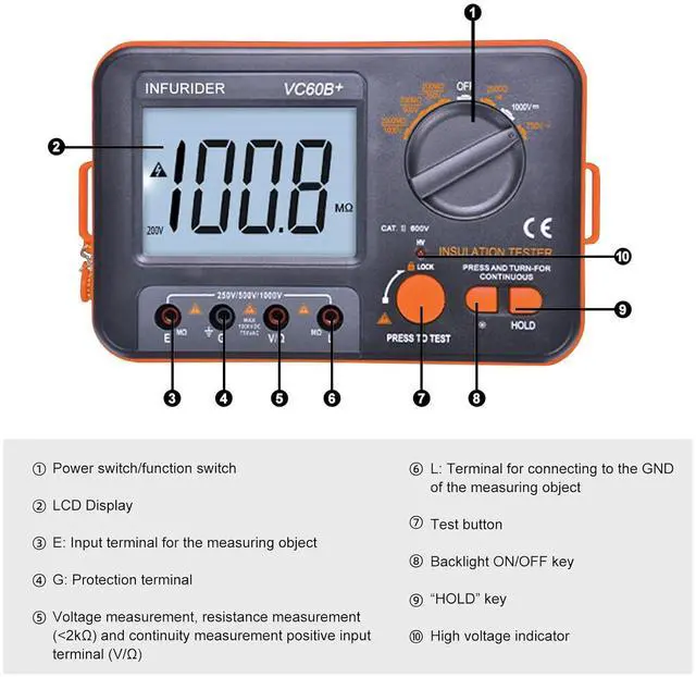 - 100% After-salePackage Included: 1 x Digital Insulation Tester, 2 x Test leads, 2 x Crocodile clips, 1 x Shoulder strap, 6 x 1.5 v batteries, 1 x User Manual. INFURIDER will provide high-quality after-sales servi
