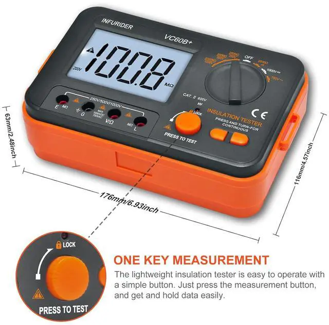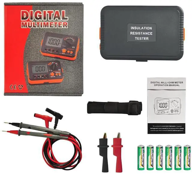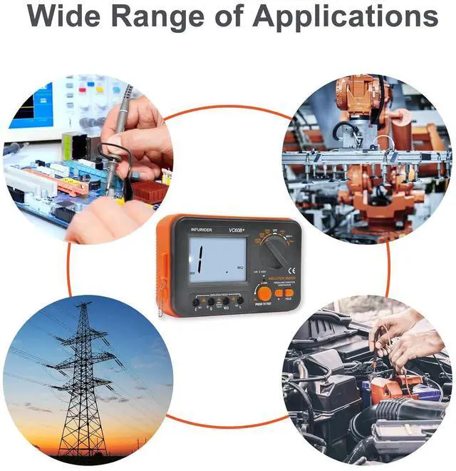 After-salePackage Included: 1 x Digital Insulation Tester, 2 x Test leads, 2 x Crocodile clips, 1 x Shoulder strap, 6 x 1.5 v batteries, 1 x User Manual. INFURIDER will provide high-quality after-sales servicefalse- Professional Insulation Tester The digital insulation tester features voltage measurement range from 250V to 1000V, resistance up to 2000M, DC voltage range from 0~1000V, and AC voltage range from 0~750V. A resistance tester that you must have is suitable for testing a wide range of electrical systems