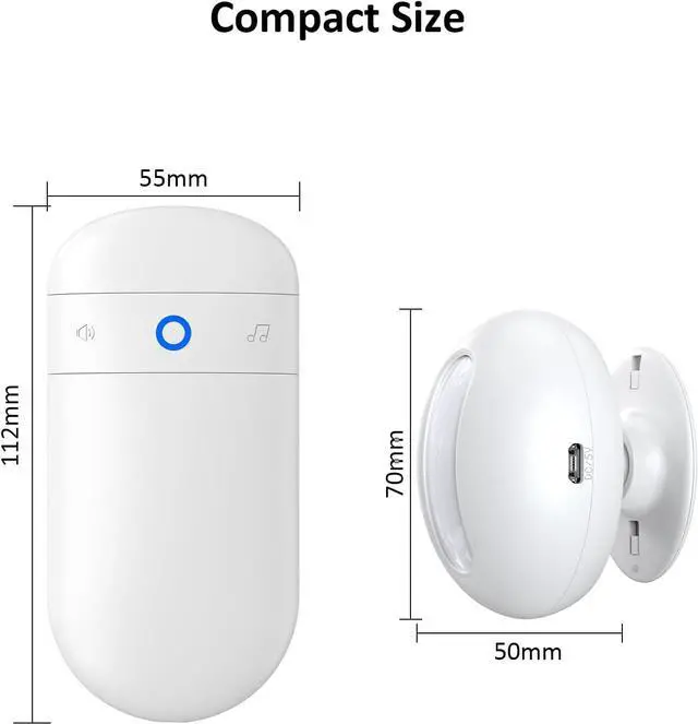 32 Ringtones & 5 Volume Levels-The motion sensor doorbell has 32 unique ringtones, including alarm sound, doorbell sound and so on; 5-level adjustable volume (0-110dB), including mute mode. Starting from the maximum volume beep, enter mute mode for the fifth time or from the minimum volume beep, enter mute mode for the first timeAdjustable Distance & Angle-The induction alarm can rotate 360 degrees, allowing you to freely adjust the angle you want to detect and protect your home safetyAbout Product-Includes 1 plug-in receiver and 1 motion sensor door chime (including 2 AAA batteries), the sensor bell supports USB power supply (DC 5V).