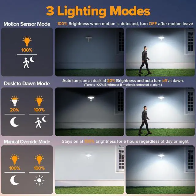 - 4 VERSATILE LIGHTING MODESThe outdoor floodlight features four versatile lighting modes: Motion-activated at 100% brightness during the night; Always-on at 20% brightness at night, with motion-activated 100% brightness; Stays on at 100% brightness for 6 hours, regardless of day or night; Test Mode. These modes accommodate various usage scenarios, making it suitable for outdoor applications such as garages, yards, porches, pathways, driveways, and swimming pools.