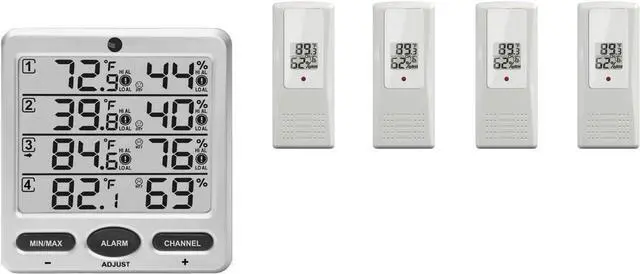 Four additional sensors can be added (f007th, f007tp, f007t, f007pf) for comprehensive monitoringfalseThe console displays temperature and humidity, minimum and maximum temperature and humidity, which can be manually resetfalseSimple to read, simple to use, and affordable, the WS-10-X4 (ws-10) includes an indoor thermo-hygrometer inside the console, and four remote thermometer-hygrometer sensors (f007th), which are all displayed at the same time. The display console can remotely read and update up to eight remote thermo-hygrometer sensors. The console includes audible and visual alarms when temperature and humidity exceed your pre-set minimum and maximum alarm settings.