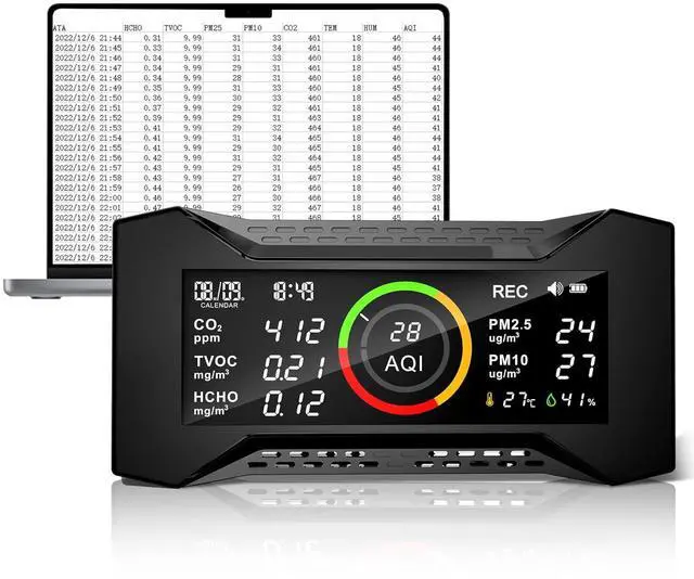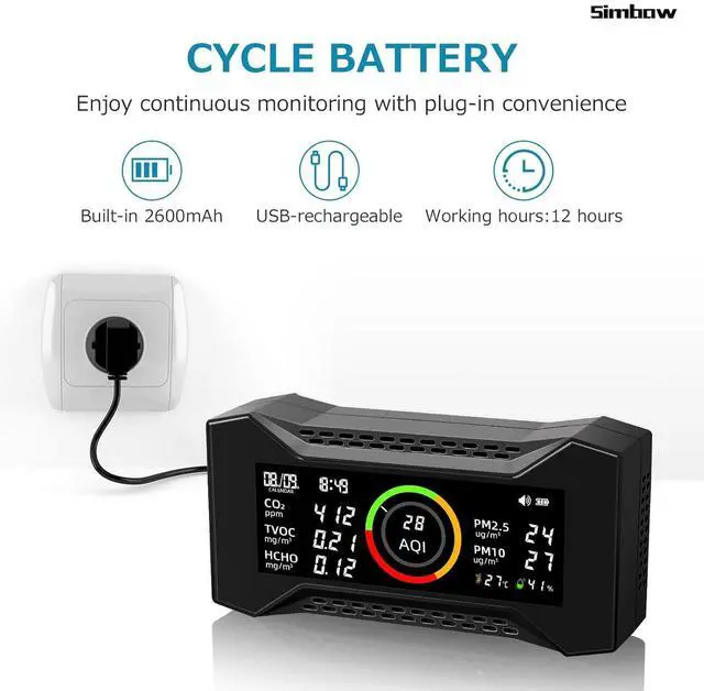 - Breathe Smarter: Simbow Air-Guardian AQPro air pollution detector is fast-responding and sensitive with a nondispersive infrared sensor (NDIR) and advanced particle sensor that monitors AQI PM 2.5, PM10, tVOCS, HCHO, CO2, humidity, temperature and time.