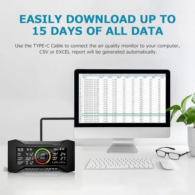 - Free Historical Data Download: The upgraded version of the air quality detector supports historical data download. You only need to connect it to the computer, and the CSV/EXCEL reports for the last 15 days will be automatically downloaded.