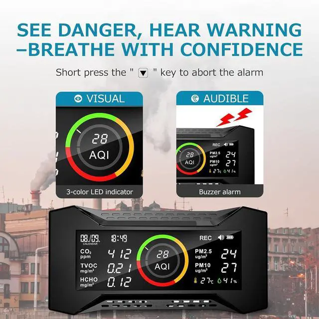 - Expect More: NO complicated settings, ready to use when turned on. The clear LED screen display shows the colorful bar of AQI, and also the alarm buzzer can be turned off at any time. All improvements are for better customer service.